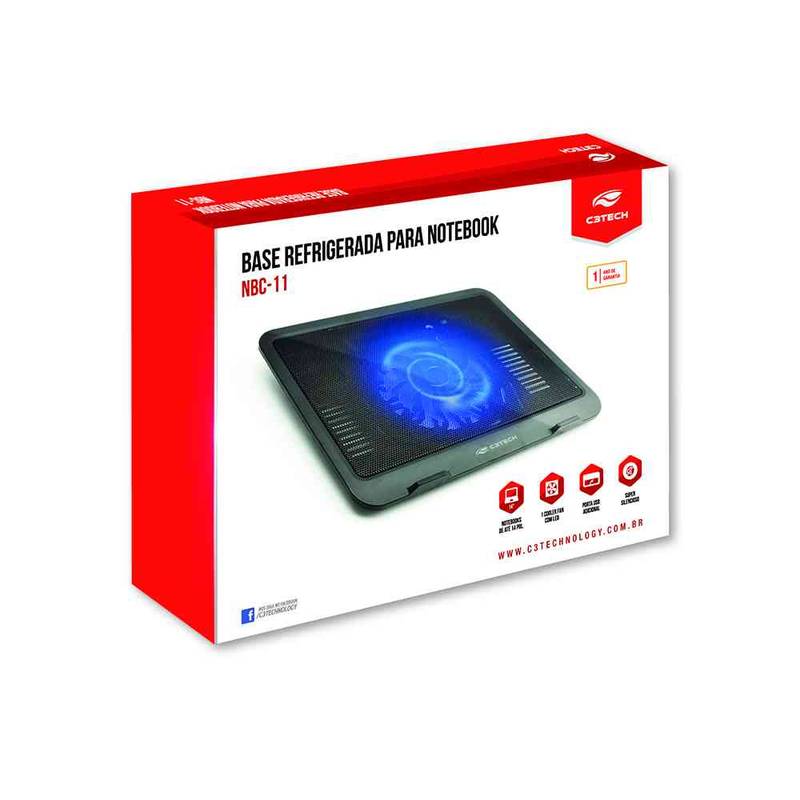 Tenha segurança, comodidade e praticidade enquanto utiliza o seu notebook com a base refrigerada NBC-11 da C3Tech!\r\rProjetada para oferecer o melhor angulo de visão para o seu notebook, permitindo longas horas de uso sem prejudicar suas mãos, pescoço e costas.\r\rO NBC-11 conta com uma silenciosa fan de 140mm que mantem o seu notebook na temperatura ideal, entregando performance e conforto.\r\rCaracterísticas:\r- Marca: C3Tech\r- Modelo: NBC-11BK\r\rEspecificações:\r- Compatível com notebooks de 10 a 14 polegadas\r- Micro Ventilador (fan) 14cm com led azul\r- Tamanho do Fan:140*140*15mm\r- Porta USB adicional\r- Material: Plástico e metal\r- Ruído: 21dBA\r- Fluxo de ar: 20CFM\r- Voltagem de operação: DC 5V\r- Velocidade (Fan): 800-1000RPM\r\rRequisitos mínimos do Sistema:\r- 1 Porta USB 2.0 disponível