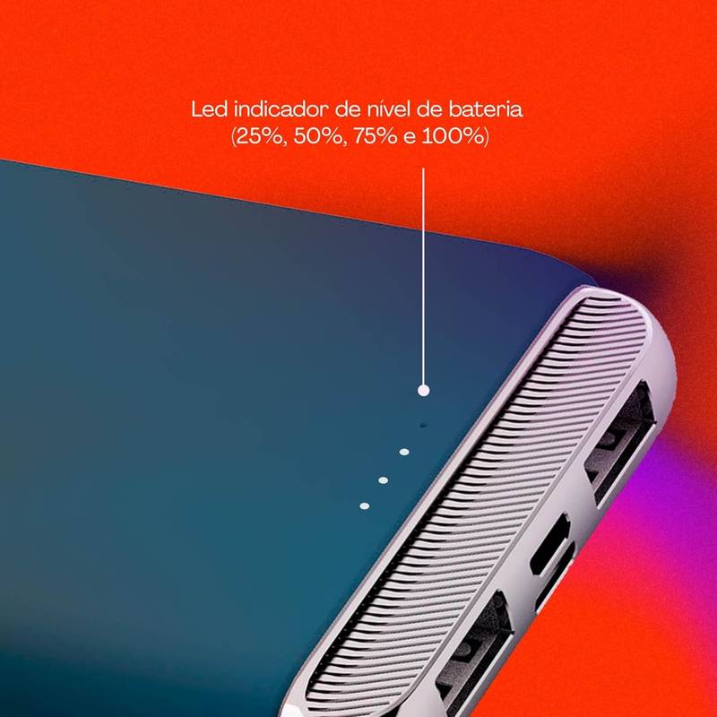 – Especificações: Com uma capacidade nominal de 12.000mAh (4A total), possui 2 saídas USB e 1 USB-C, bem como entrada Micro-USB para recarregamento. As saídas USB oferecem 5VCC-2A cada, totalizando 4A, enquanto a saída USB-C suporta até 5VCC-2A. A bateria é de lítio-polímero de 12.000mAh e apresenta eficiência de conversão de até 65%. O indicador de bateria possui 4 LEDs indicando os níveis de carga, e o material é resistente em policarbonato.