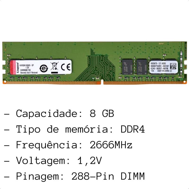 – Memória de 8GB DIMM DDR4 2666Mhz 1,2V 1Rx8 para desktop – KVR26N19S8/8 \r
